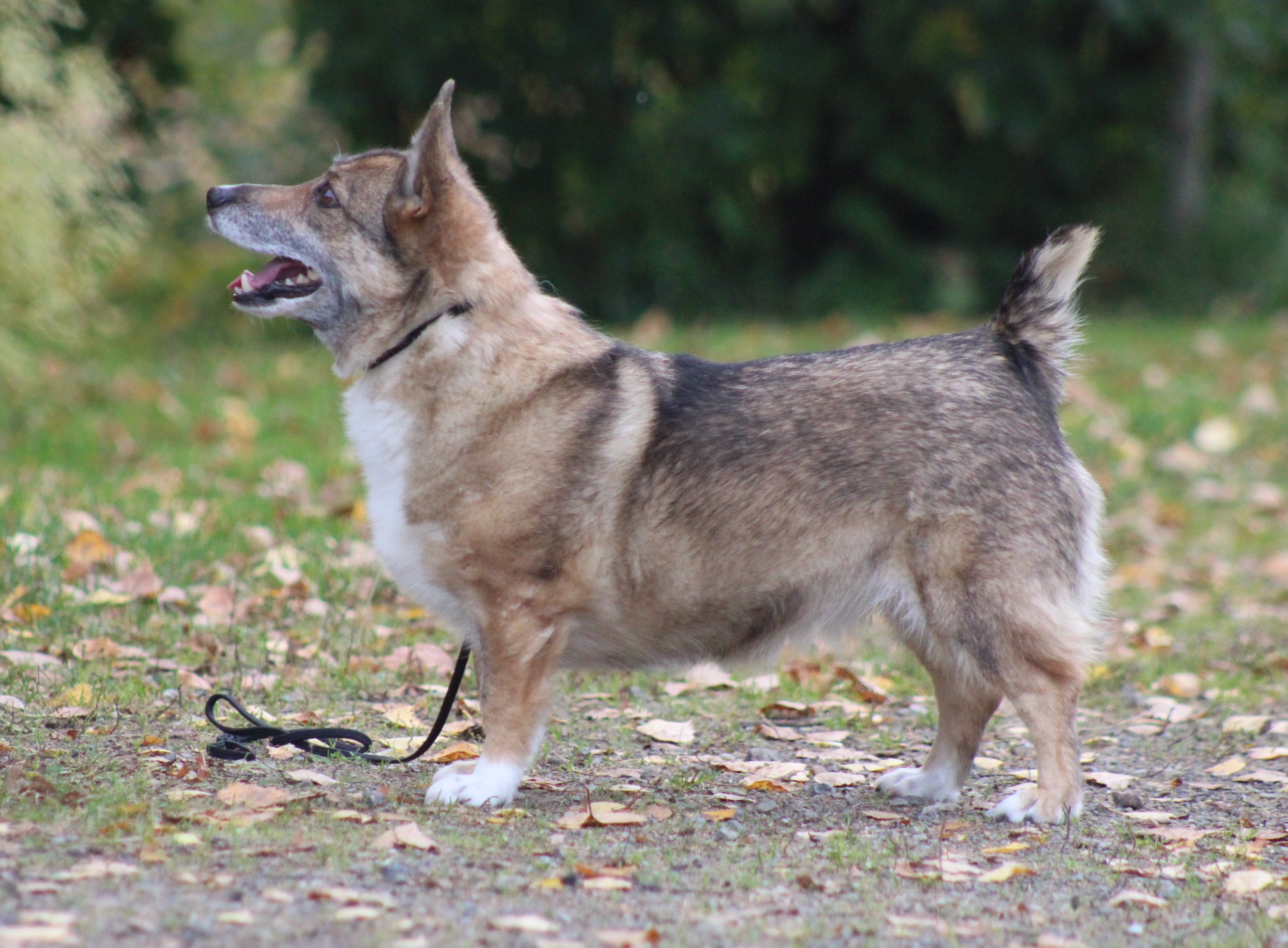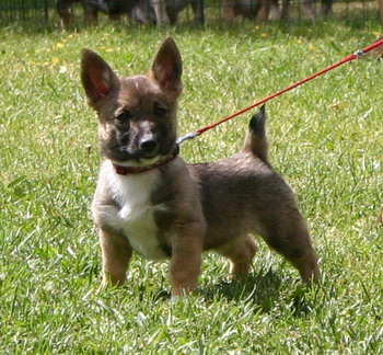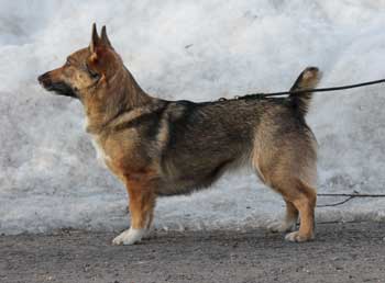 Punaisenkeltainen, poskimerkit riittämättömät, valjaskuvio erinomainen, oikeat valkoiset merkit. Koko 30 cm, täydellinen saksipurenta.
