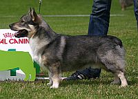Koko 33 cm | harmaa + oikeat valkoiset merkit, poskimerkit ja valjaskuvio saisivat olla selvemmät | täysi saksipurenta | töpö häntä. Luonne avoin ja ystävällinen. Elelee maalaiskoirana, eikä ole tottunut esiintymään. Pupujussit ja kauriit kiinnostavat kovasti!