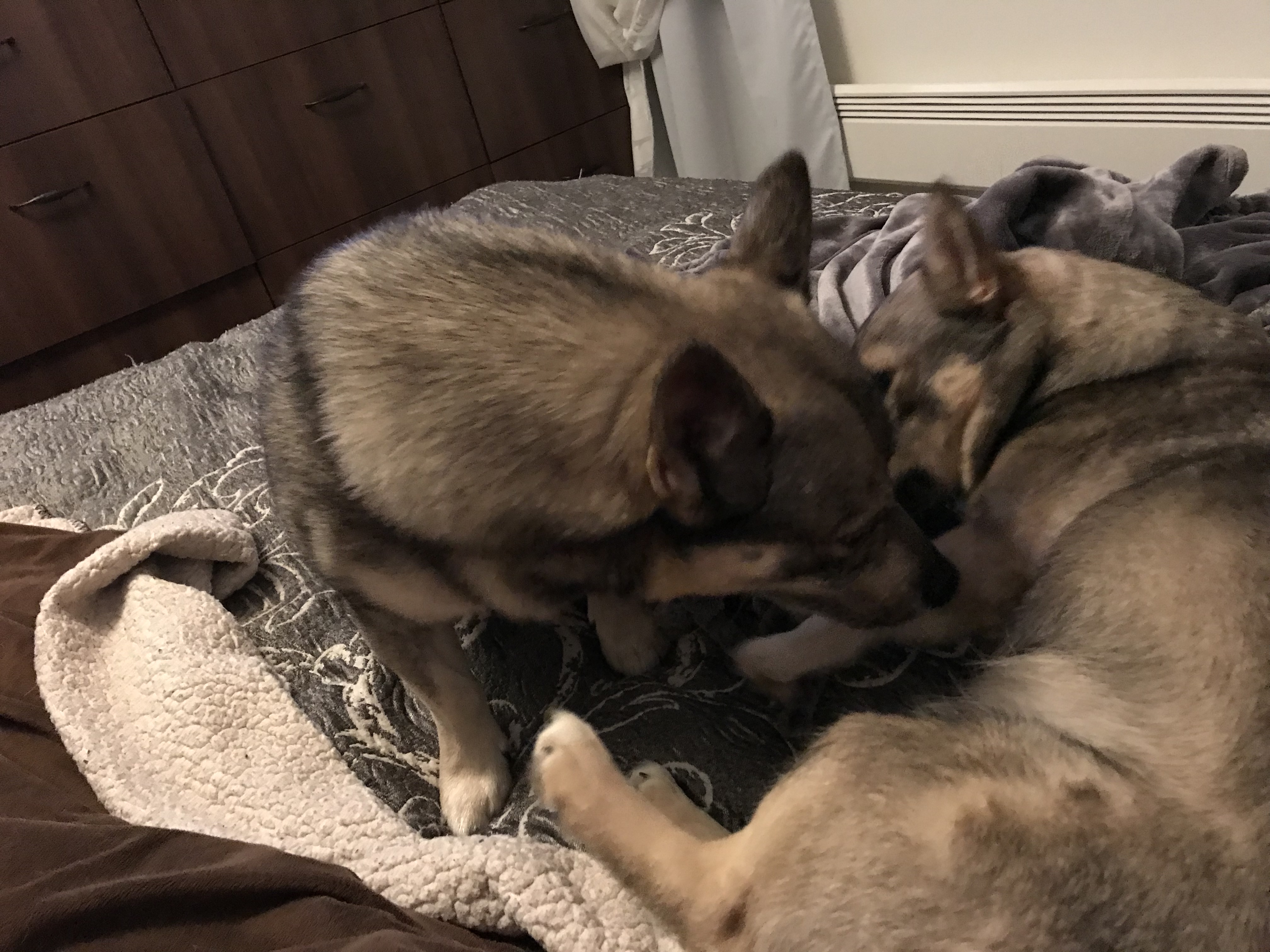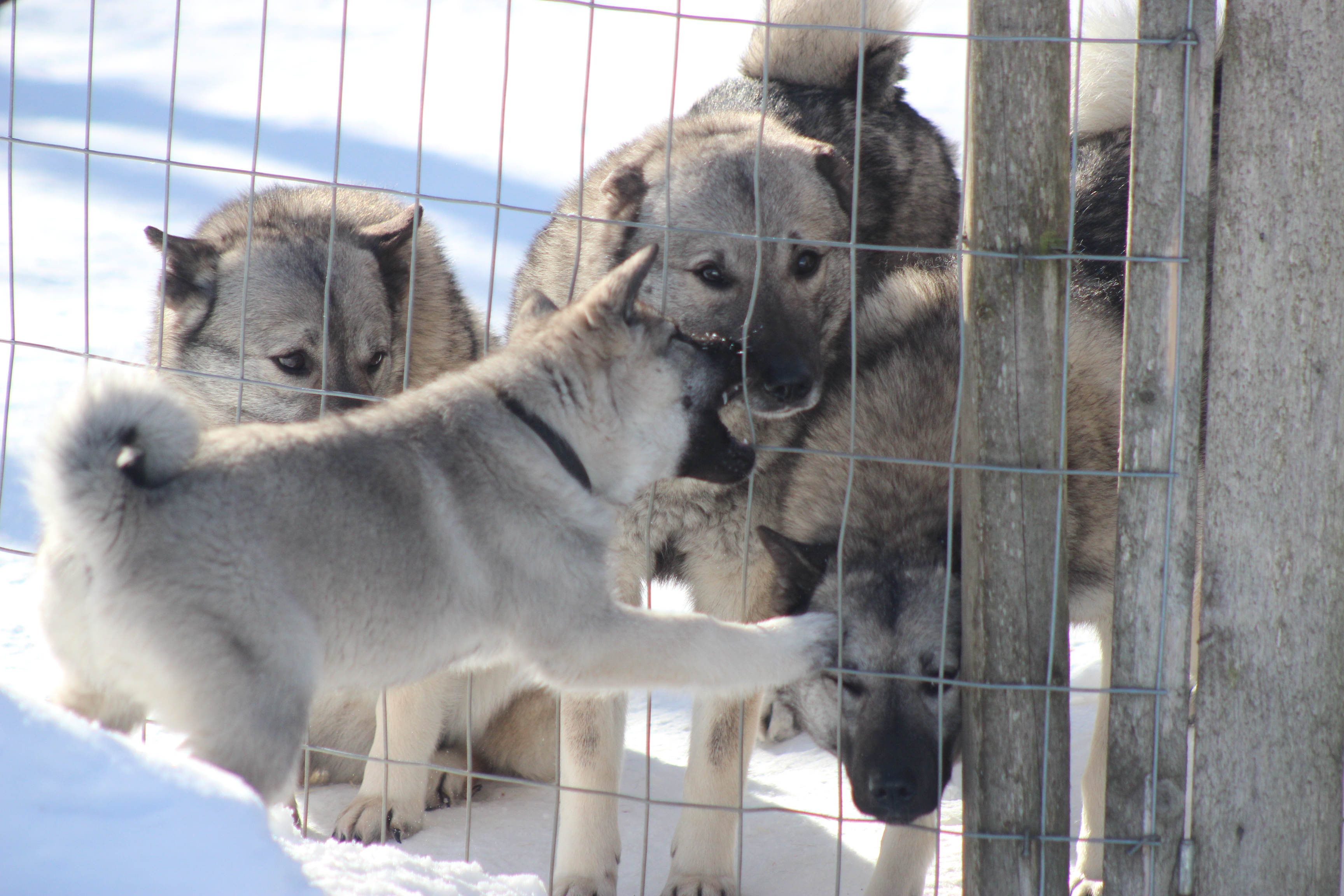 Dooris on päässyt aikuisten hirvikoirien kanssa päiväksi kisaamaan. Muutoin Dooris on aivan ilmiömäinen isosisko pikkupennuille, vaikka ei itsekään ole kuin vajaa 4 kk.