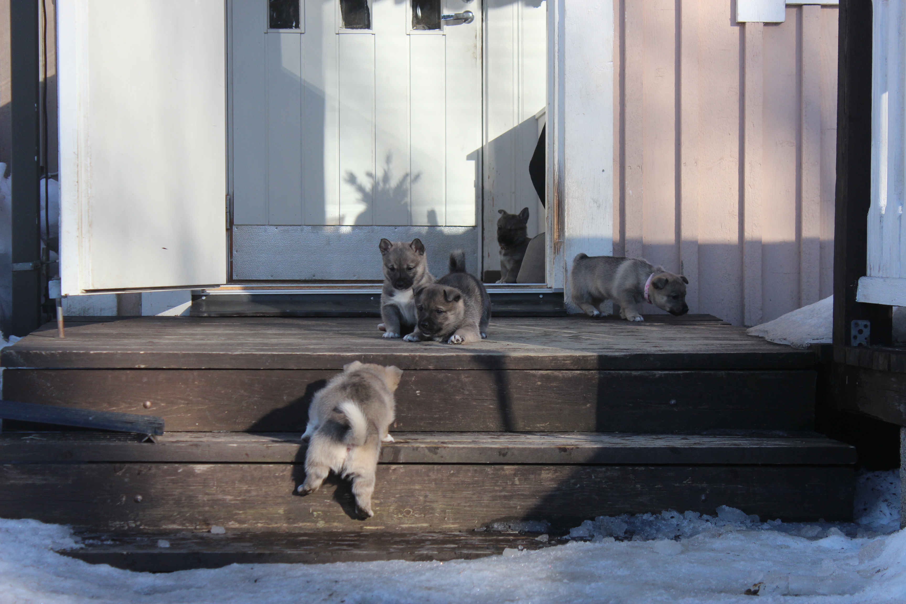 Sitä myöten kun lumi sulaa pihasta, penneleiden liike senkun kasvaa. Tantereelta kuuluu jo aikamoinen melske. Pennut viihtyvät hyvin pihalta eikä oikein haluaisi tulla edes sisälle.